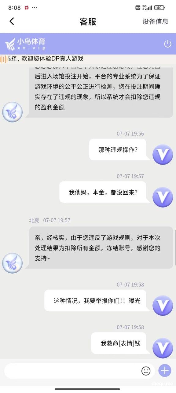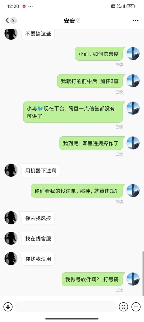 期间输输赢赢 提款都是正常的,可是就在昨天也就是7.7号充值了两千多,打了几个小时余额来到了2W,随后提款等了半小时都没有到账,期间还在投注,突然提示被迫下线,再登陆就显示账户异常。请联系客服。联系客服:就说违规投注持续关注@xinwen1看后续。至于怎么违规也说不出各所以然。玩彩票多年从来也没遇到过这样的事情。(本人玩法:喜欢追豹子,前中后豹子,任选豹子,45=23 89=23单式54注)在此希望得到曝光这样的垃圾平台,惊醒还在小鸟玩的其他玩家。这样的形式做法迟早玩完!