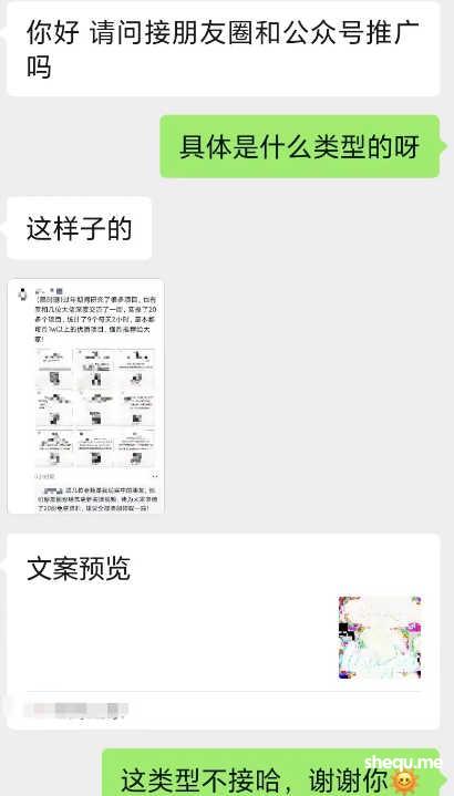如果文案中涉及到二维码,最好自己先扫一下,如果发现是加群或者看着就不正规的账号,果断拒绝。